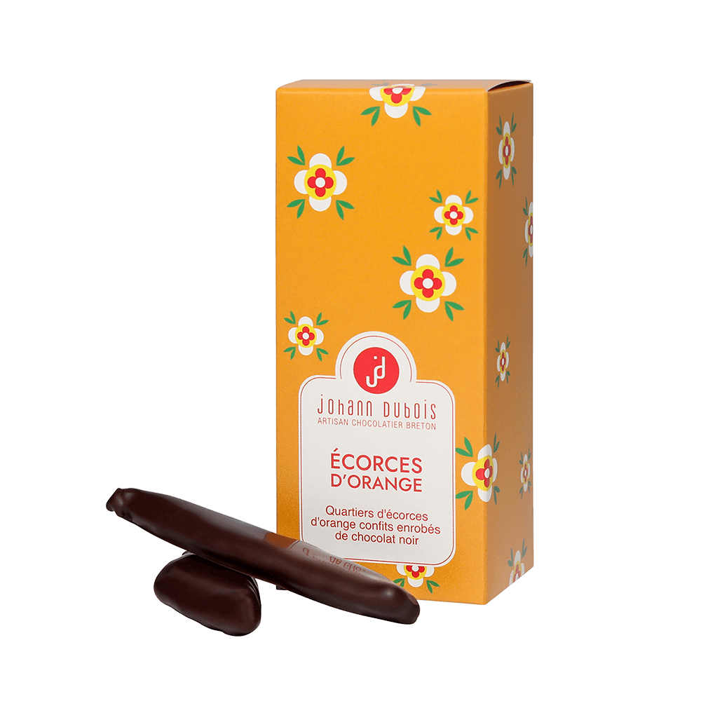 Écorces d’oranges enrobées de chocolat noir 66%. Ces quartiers d’oranges sont confits artisanalement dans le Sud de la France. Coupés un à un dans nos ateliers, ils sont ensuite passés dans un mélange de cacao et amandes avant d’être enrobés de chocolat noir.
